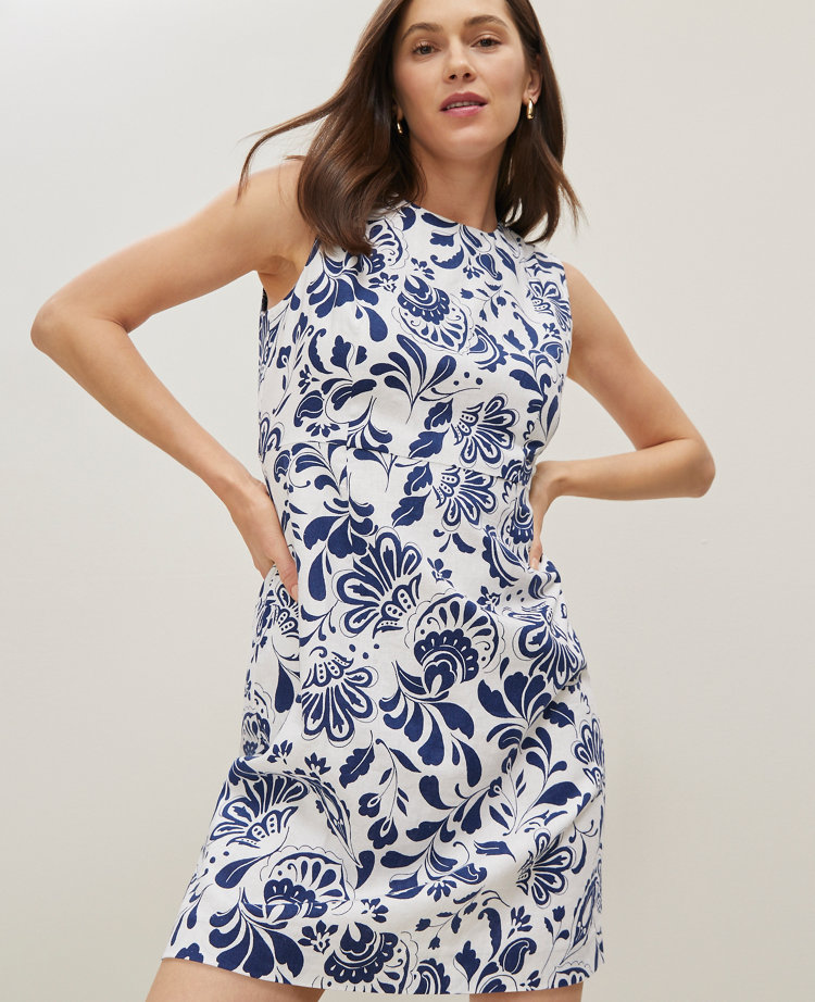 In a lovely floral linen blend, this sheath dress is impeccably shaped to fit and flatter. Round neck. Sleeveless. Back button keyhole. Hidden back zip closure. Lined.