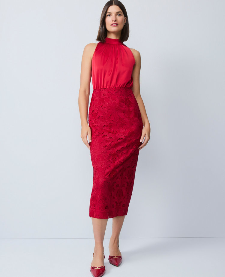 A smooth satin bodice and delicate lace skirt give this elegant sheath the perfect textural appeal. Halterneck. Sleeveless. Keyhole button closure. Back vent. Lined.