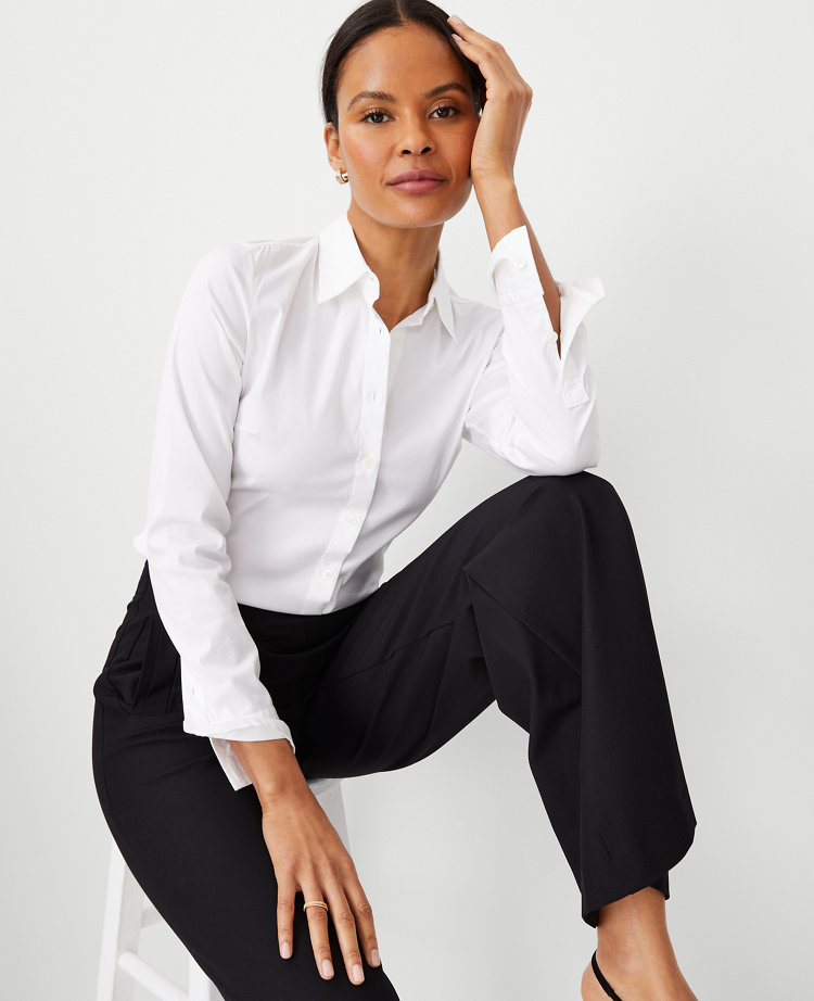 We love the classic appeal of a crisp button-down with a touch of modern stretch. Point collar. Long sleeves with button closure. Button front. Back yoke. Shirttail hem.