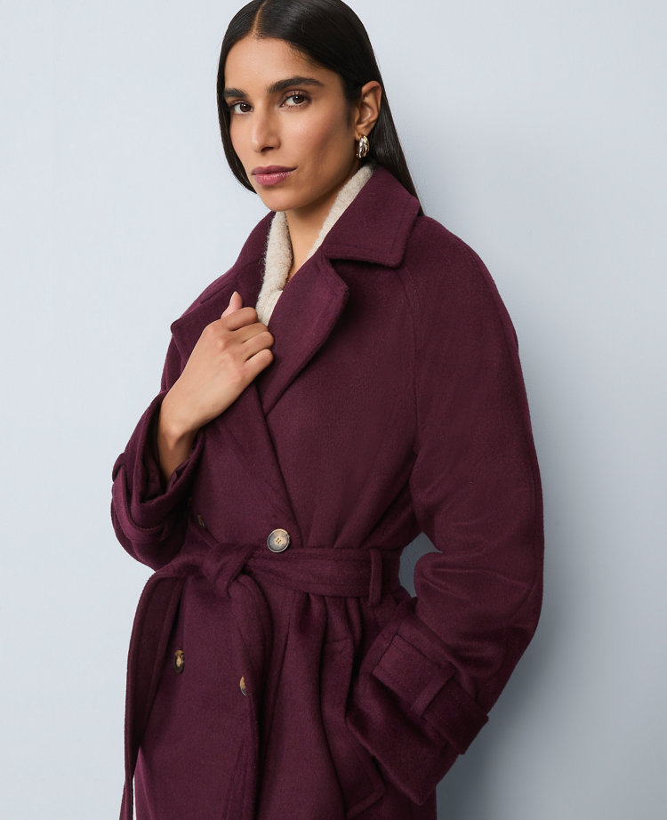 With tailored touches and a flattering belted silhouette, our trench coat will keep you warm and looking chic. Notched lapel. Long sleeves with button tabs. Double breasted button front. Belt loops. Self-tie belt. Angled front flap welt pockets. Back vent. Lined.