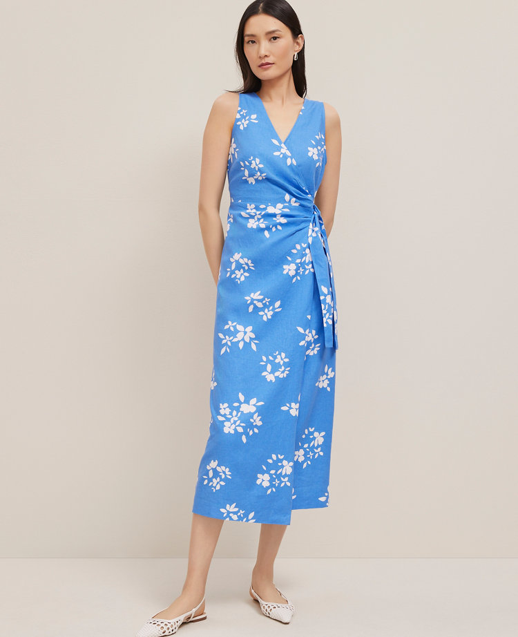 Petite Floral Linen Blend V-Neck Wrap Dress