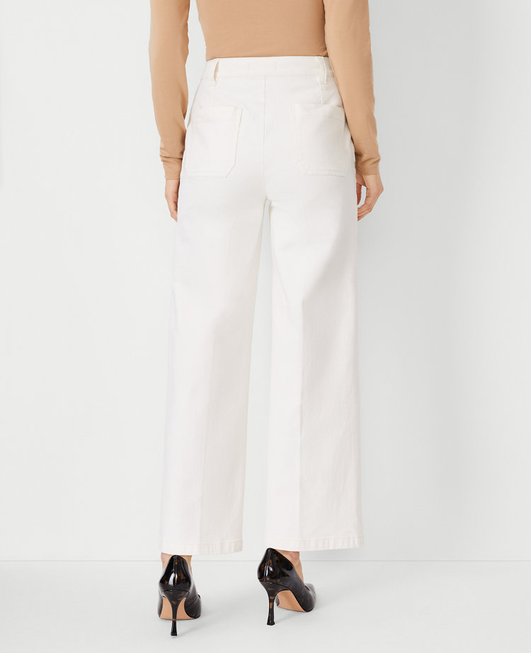 Topped with button front plackets for a nautical nod, these wide-leg crop jeans feature a flattering high waist. Front zip with hook-and-bar closure. Button front plackets. Back belt loops. Back patch pockets.