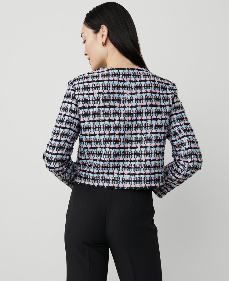 This cropped jacket — in smart, striped tweed — keeps outfits fresh and pulled together. Round neck. Front hook-and-eye closures. Long sleeves. Front flap besom pockets. Lined.