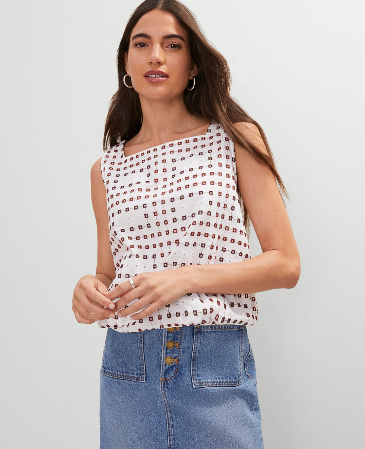 Discover Ann Taylor Weekend. Effortlessly polished pieces for wherever your plans take you. Intricate eyelet detailing brings a feminine feel to this exaggerated bubble silhouette. Square neck. Sleeveless. Elasticized hem. Lined.
