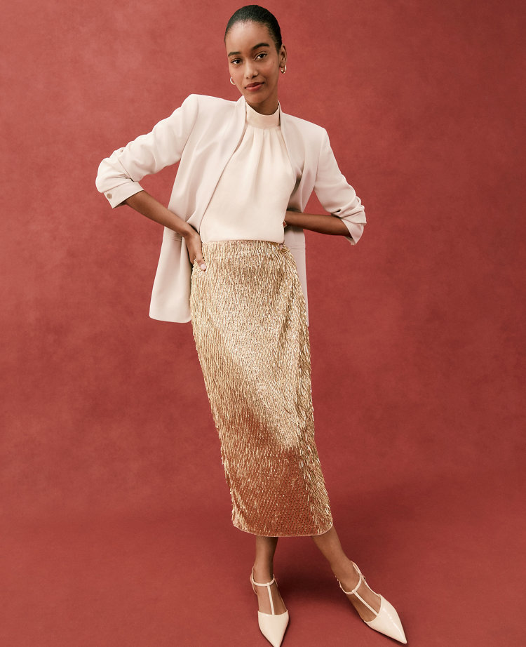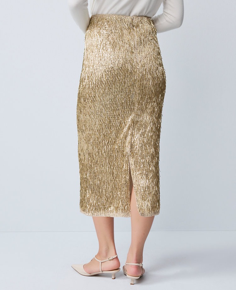 Sparkle and shine in this column midi skirt that’s illuminated with light-catching sequins. Hidden back zipper with hook-and-eye closure. Back vent. Lined.