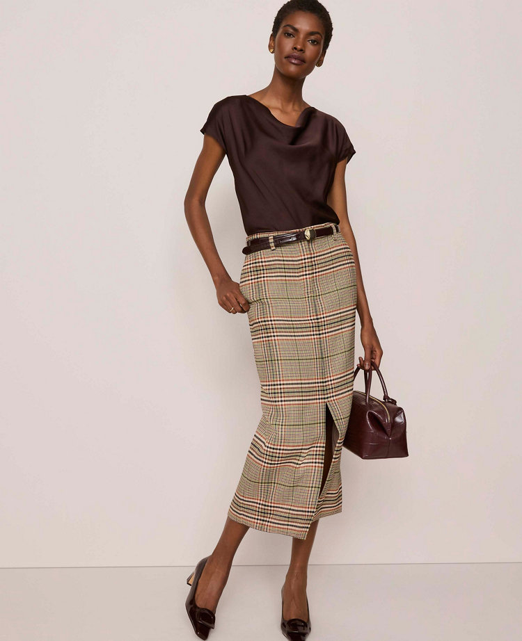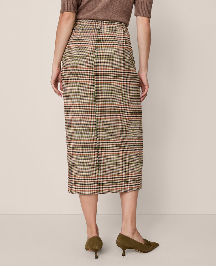 With smart trouser-inspired styling, this midi skirt has a long, lean, impeccably cut column silhouette. Front-zip closure with an extended hook-and-bar closure tab. Belt loops. Front slash pockets. Front vent. Back welt pockets.