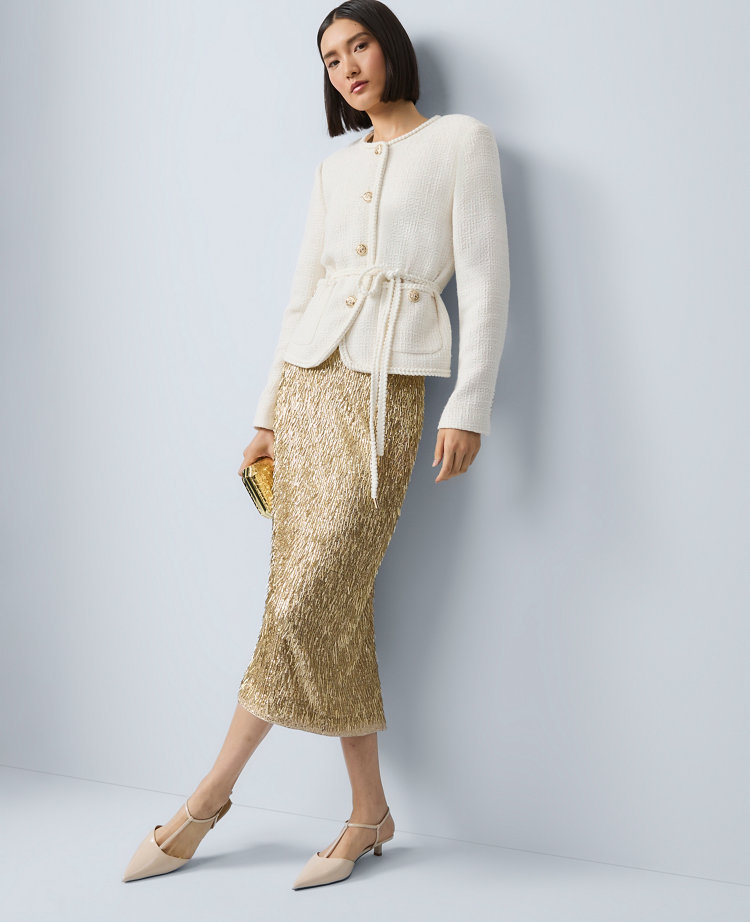 Utility-inspired pockets update this sophisticated tweed jacket with modern attitude. Crew neck. Front-button closures. Self-tie belt. Long sleeves. Front-buttoned patch pockets. Lined.